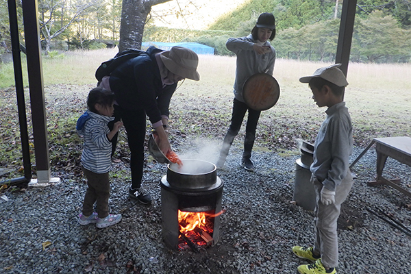 昔のように森林エネルギーを活用した、薪で煮炊きする夕食作りと五右衛門風呂焚きに挑戦します。薪割り、火起こしはどうやったら上手くできるか、考えて試行錯誤する力と友達との協力が大切です。