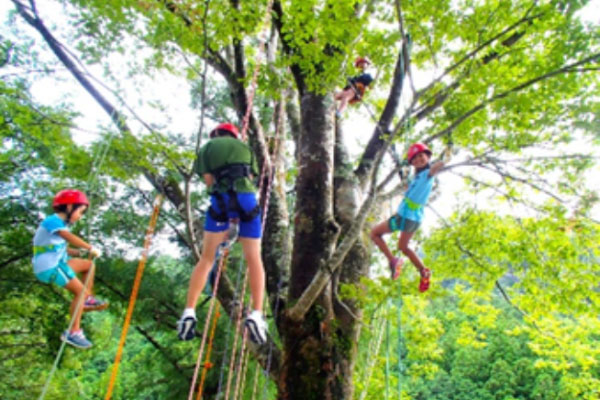 巨木にロープを使って自分の力で登っていきます。鳥が梢から眺めるような場所から、森の観察ができます。ロープワークを習って、自分の目標の場所まで登っていく過程は、勇気と挑戦の後に達成感を感じられる体験です。