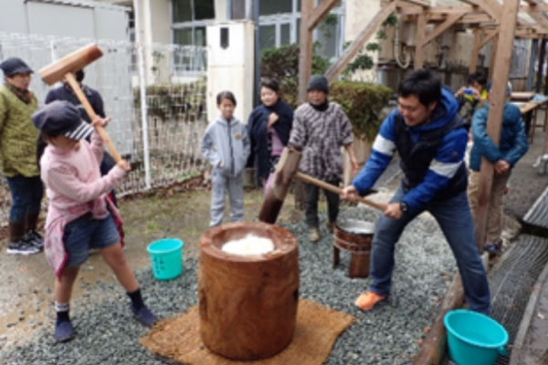 お正月をはじめ、祭り事には欠かせない「お餅」、臼と杵を使って昔ながらの方法で餅つきをします。手仕事には身体を上手く使わないとできない物が多く、餅つきもその一つ。作業や道具に併せて身体を使う能力を養い、つきたてのお餅を味わえる体験です。