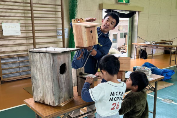ムササビ、小鳥などに合った巣箱を作成し、巣箱を木にかけます。