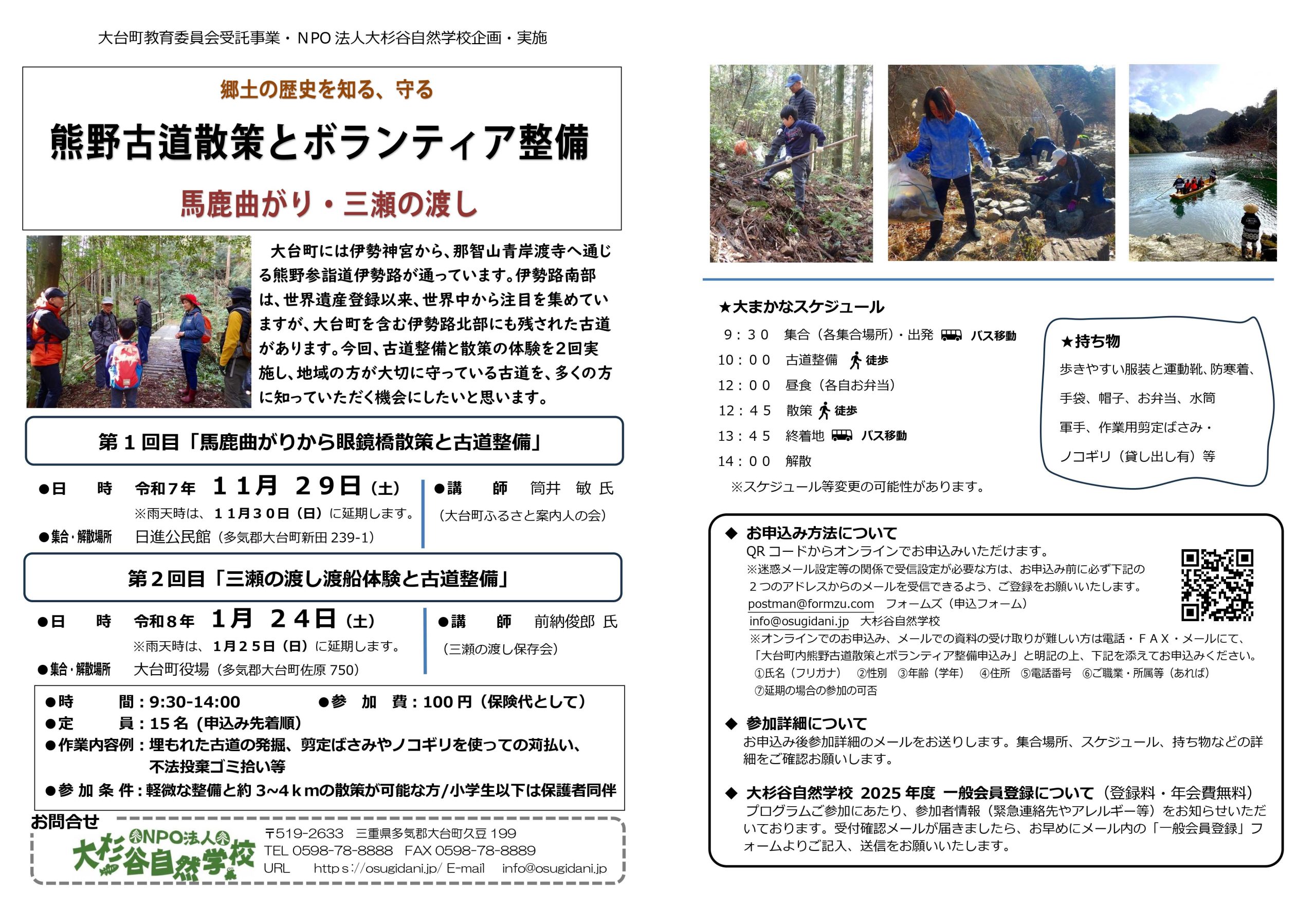 熊野古道散策とボランティア整備 「プログラム申込み後の流れ・ご参加にあたっての注意事項 」「特定商取引法に基づく表記」をご一読の上、お申込みいただきますようお願いします。 個人情報に関する取り扱いは「プライバシーポリシー」にてご確認ください。 チラシ(PDF)のダウンロードはこちら